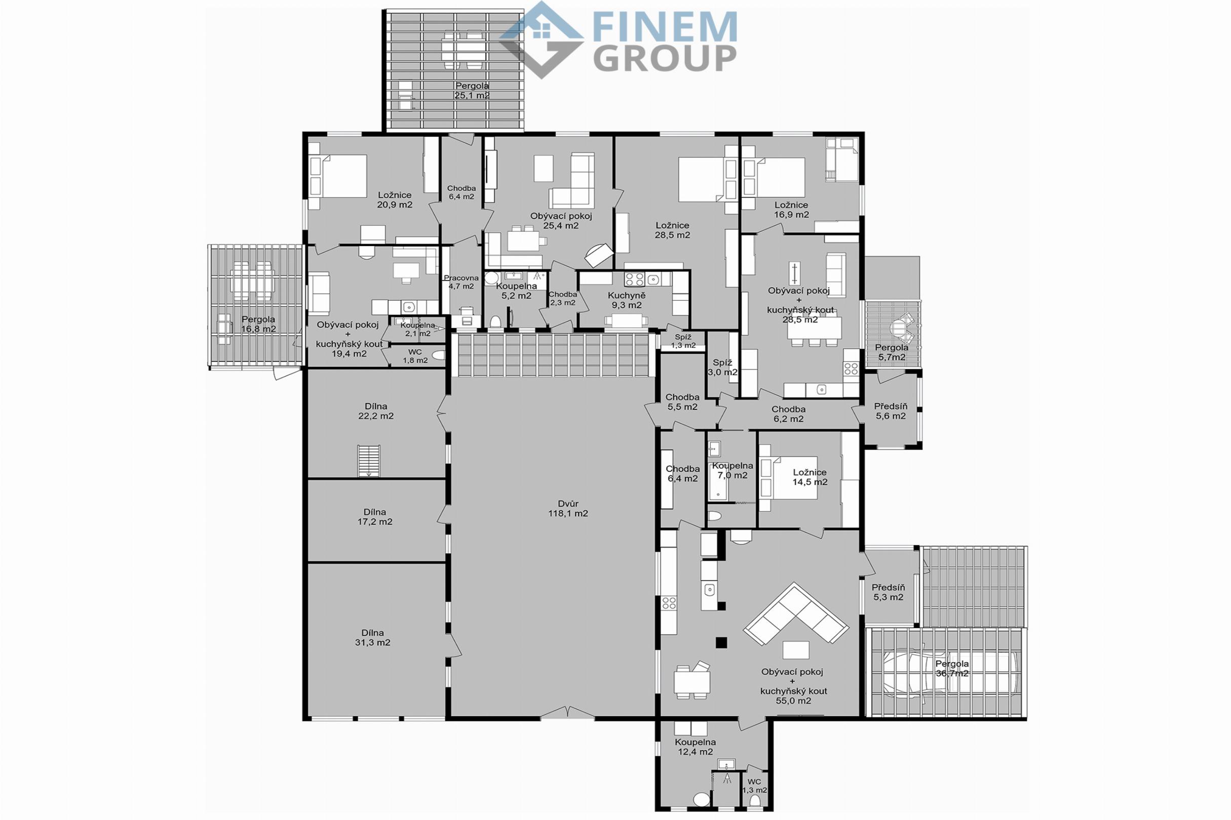 - pergoly navazující na obytnou část, vhodné pro venkovní posezení,